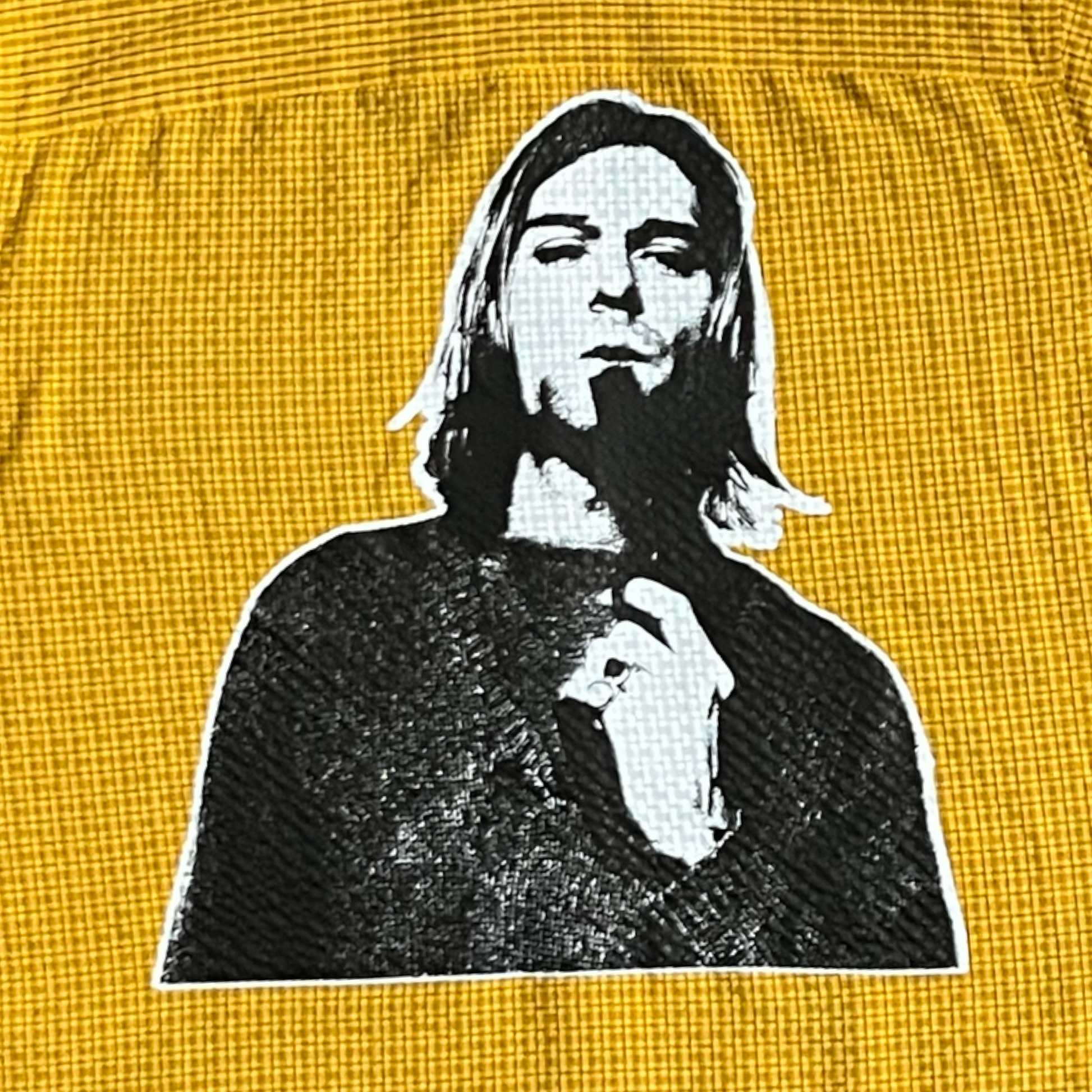Screen printed pieces, with embroidery on front.
