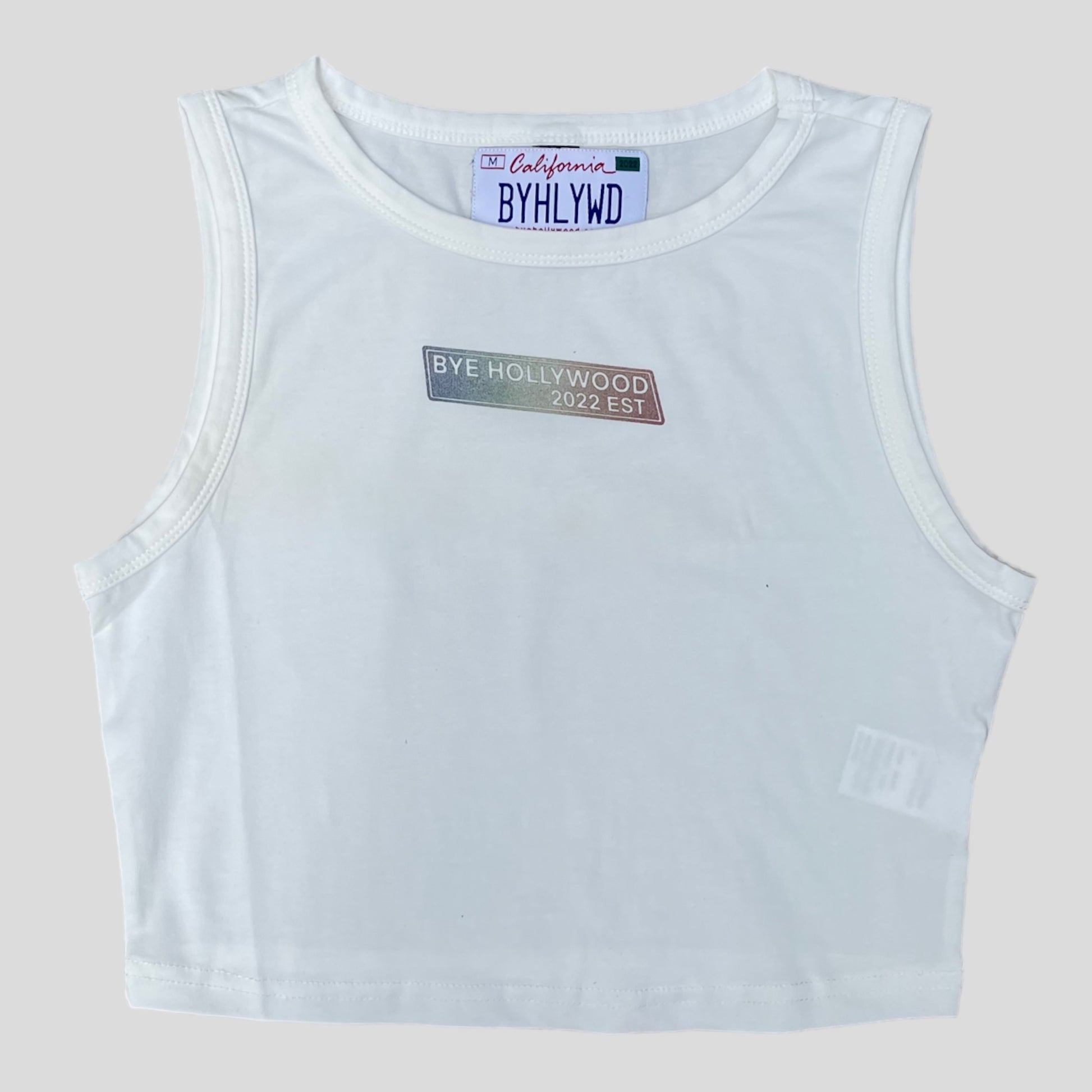 Cropped tank tops, with our Bye Hollywood street sign logo in a custom made rainbow ink!